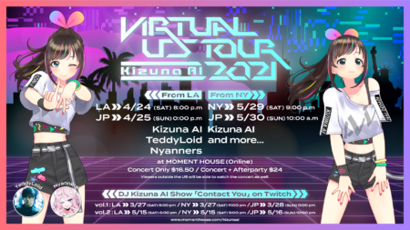今回のツアーは、ロサンゼルス公演、ニューヨーク公演の2つのライブと、エクストラ公演としてDJ Kizuna AIによるオンラインDJイベント「CONTACT YOU presented by DJ Kizuna AI」の開催が予定されており、ロサンゼルス公演のゲストとして、アメリカ国内においても多くのフォロワーを持つNyanners、TeddyLoidの参加が決定しています。