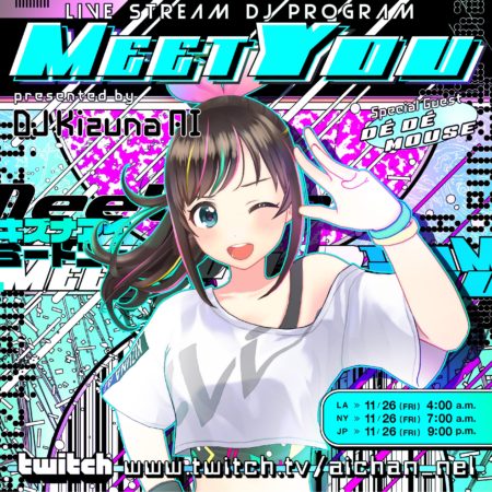 また、リリース前夜の11月26日(金)には DJ Kizuna AI による自主開催のオンラインDJ配信プログラム「Meet You」(ミートユー)も合わせて開催。スペシャルゲストに DÉ DÉ MOUSE も登場し、番組配信直後のリリースに向けて盛り上がること間違いなしだ。